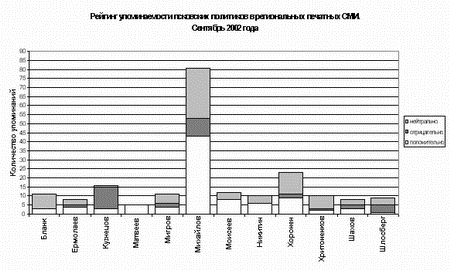 Показателен для анализа также спектр (общее число) упоминаемых в газетах политиков. В какой-то степени он отражает не только степень политизированности издания, но и тематическое разнообразие публикуемых материалов, а также степень его официальности (официозности).