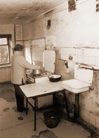 Пара месяцев существования в таких условиях прибавляет столько же опыта, сколько пара лет нормальной уравновешенной жизни. Взять хотя бы попытку приготовить пищу. На половину этажа – четыре конфорки, каждая горит по-своему и регуляции не поддается. Тушить их нельзя ни днем, ни ночью, потому что потеряны ручки, поддержание огня в очаге – святейшая обязанность каждого. Горячая вода просто не предусмотрена, в кухне и в так называемой «постирочной» водопроводный кран только один - ледяной. Раковин штук пять, но исправны, конечно, одна-две. Тот, кто умудряется каждое утро чистить зубы и тем не менее вовремя приходить на работу, вполне подготовлен к карьере спецагента. А уж чего стоит общение с «аборигенами», которые неминуемо попытаются привлечь вас к общему житию…