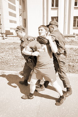 После того, как я уже перестал оказывать сопротивление, менты положили меня на землю и начали, не смотря ни на что, избивать меня дубьем, а потом заломав руки потащили к консульству, все это запечатлила Юля с ПЛНа, за что ей отдельное спасибо. Милиционеров не пугали не камеры, ни большое количество свидетелей, видимо милиции у нас можно избивать несопротивляющихся граждан, пускай и участников не санкционированного пикета и хватать девушек, которые годять им в дочери за руки и замахиваться на них дубиной.