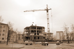 | Новый дом еще не дотянулся до уровня своего соседа – 7-этажного здания ДСК, но должен дотянуться и «переплюнуть» его на десять с лишним метров. Фото: Лев Шлосберг |