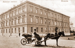 | Землеустроительный техникум в Пскове был преобразован из землемерного училища, сохранил высокий уровень образования и даже дореволюционного директора – межевого инженера Евгения Васильевича Семёнова. Здание на улице Гоголя, 7 не сохранилось. |
