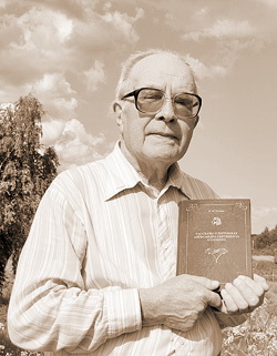 | Виктор Михайлович Русаков с книгой «Рассказы о потомках Александра Сергеевича Пушкина». |