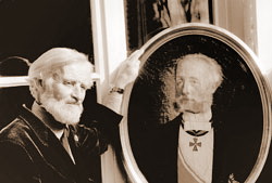 | Барон Б. Г. Врангель с портретом предка из рода Врангелей во время поездки в Германию. Начало 1990-х гг. Фото из архива семьи Лапето. |