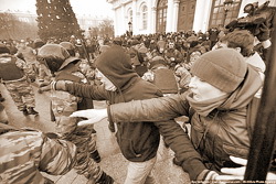 Вначале акция носила относительно мирный характер: собравшиеся жгли фаеры и скандировали националистические лозунги. Часть собравшихся была в масках. Это длилось примерно час. Обстановка накалялась и требовала выхода. Милиция не вмешивалась.