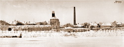 | Панорама набережной реки Великой. Мстиславская башня и первая псковская электростанция. Фото П. Н. Чистякова. 1909 г. Архив Института истории материальной культуры (Санкт-Петербург). |