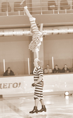Почти такую же, что продемонстрировали на шоу чемпионы мира по спортивной акробатике Владимир Беседин и Алексей Полищук. Но они-то переоделись клоунами. Среди обычных псковичей клоунов не так много, так что большинство желающих на шоу попасть не смогли.
