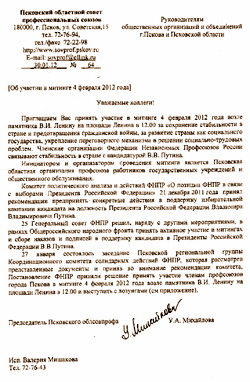 | Приглашение Псковского облсовпрофа к руководителям общественных организаций и объединений. 30.01.2012 г. |