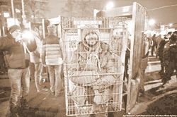 | Антон Глотов (человек-танк) на Пушкинскую площадь явился в клетке и не прошел металлоискатель. Фото: Илья Варламов |