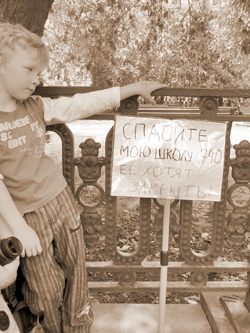 Возле металлической ограды, перекрывающей вход в сквер, скромно стоят мужчина, женщина и ребенок. К ограде прислонен транспарант: «Спасите мою школу № 740. Ее хотят закрыть». Спрашиваю: «За что закрывают?» Мужчина уверен, что всему виной – дорогая подмосковная земля, которой еще Юрий Лужков с супругой подбирались. Девятилетка в Молжаниновском районе оказалась неперспективной.